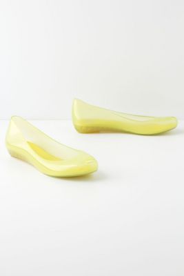 Holding an apple.. She is wearing tights with walking human figures and transparent rainday shoes.